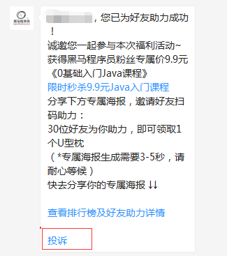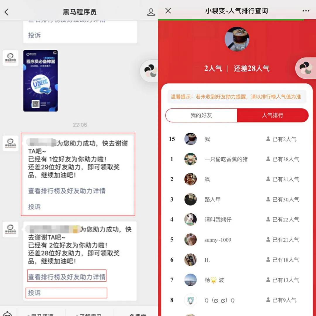 3、好友助力成功之后有提醒,并且每增加一个都会提醒一次,会告知助力进度,还可以看到助力排行榜,刺激用户的好胜心,大致看了一下,目前前一百名的助力总人数,大概在300人次左右,活动的触及人数不算多,因此使用公众号作为用户留存第一平台是比较理想的。