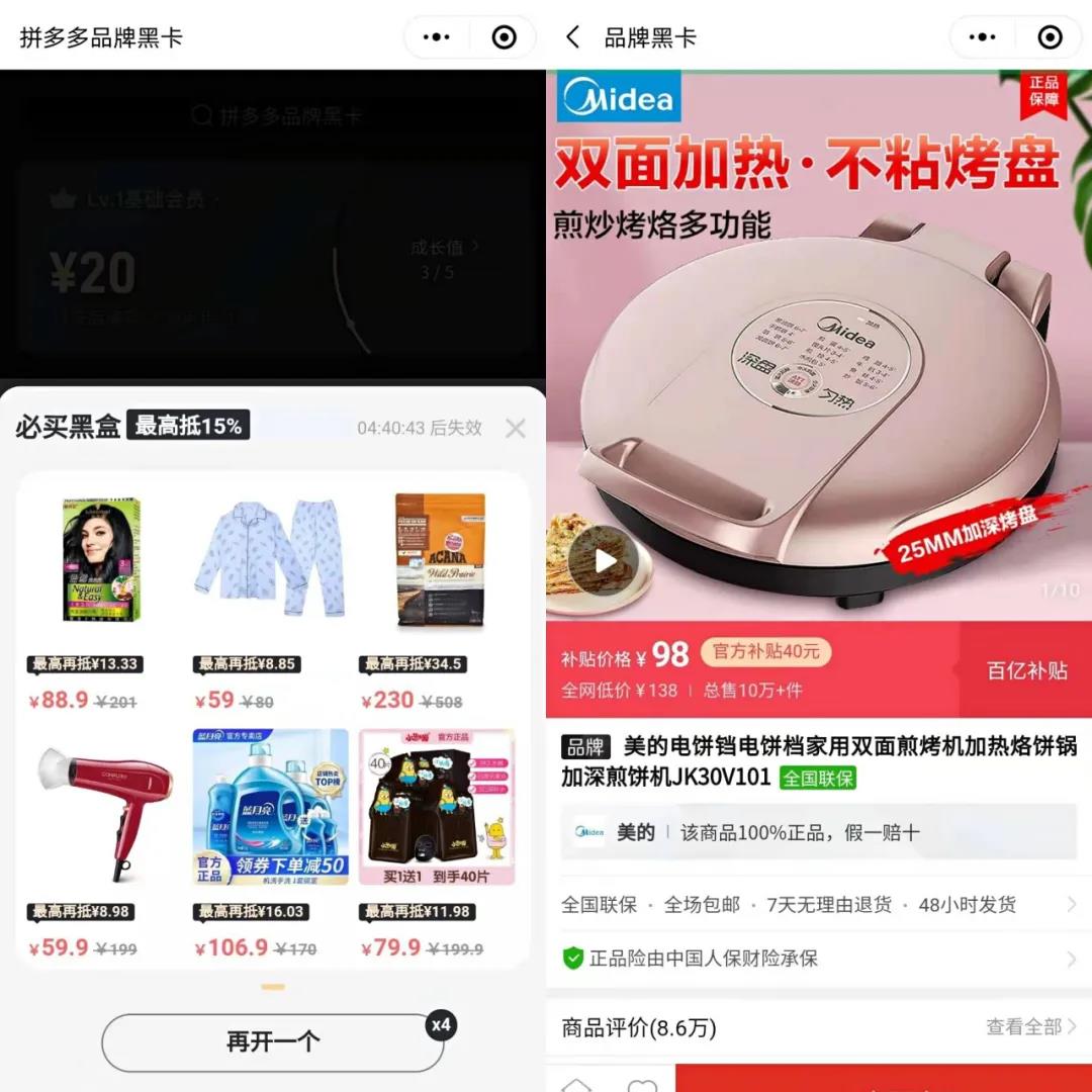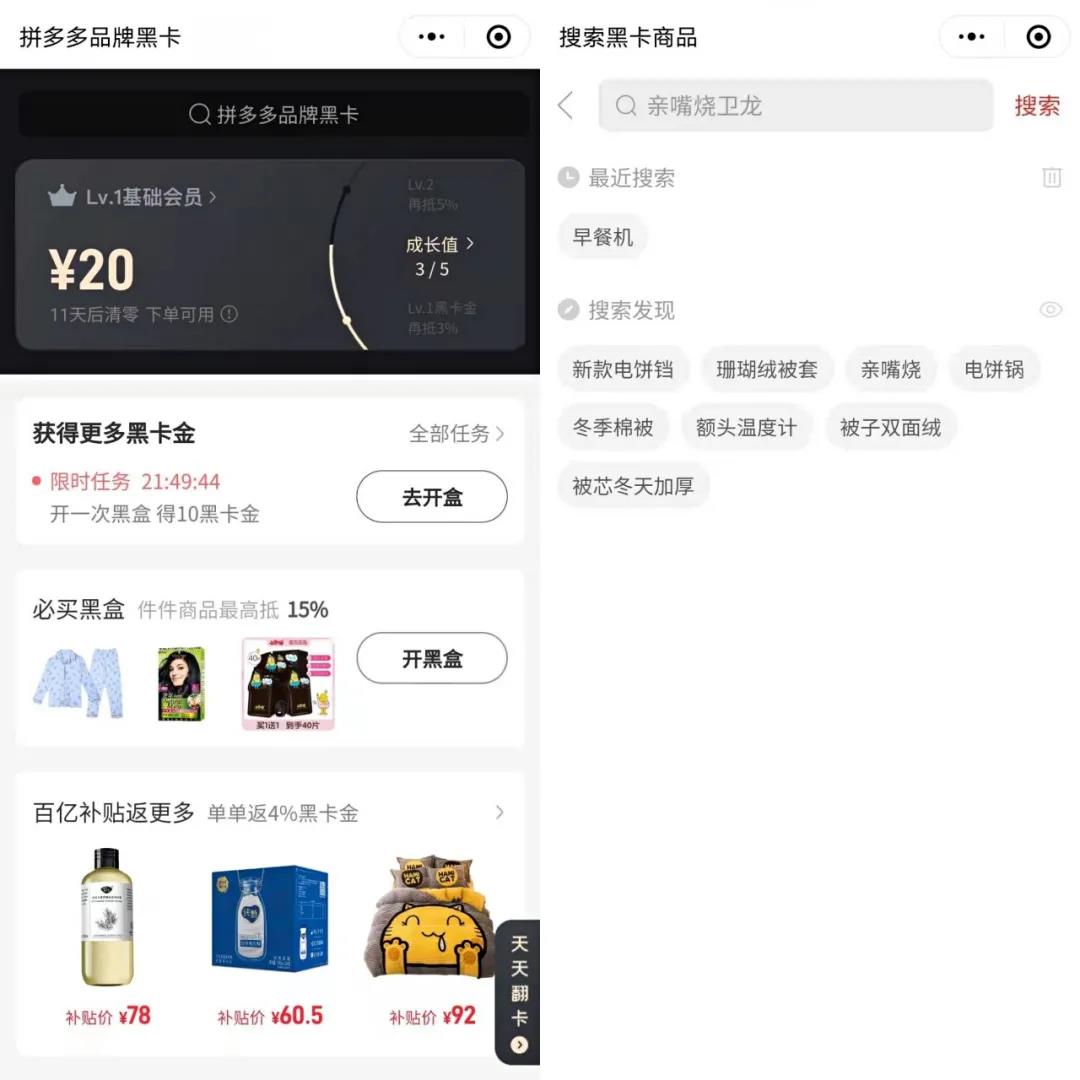通过设定、改变移除用户心中的参照物,达到用户评价体系的方式叫做锚定效应,常见的活动形式为秒杀价、限时折扣,拼多多品牌黑卡小程序通过设置抵扣价格、补贴价格,返现金的形式,从视觉到氛围,让用户感受到优惠。