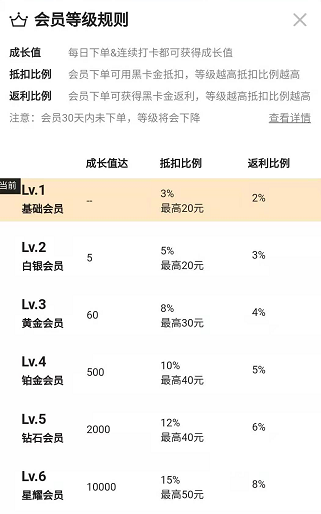 分为6个等级,LV1到LV2升级的门槛比较低,随后升级难度依次增加,减少升级难度。但是用户如果长时间不签到或者下单,等级会对应下降,但具有一定用户沉没成本。