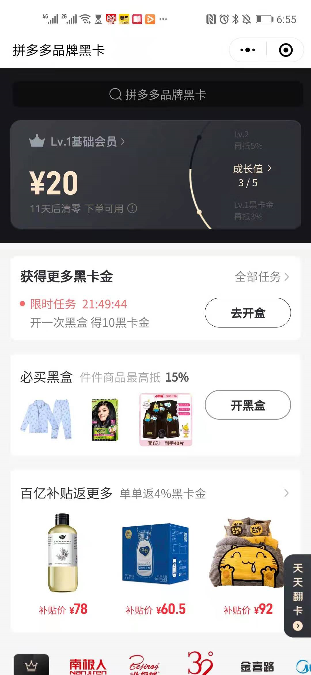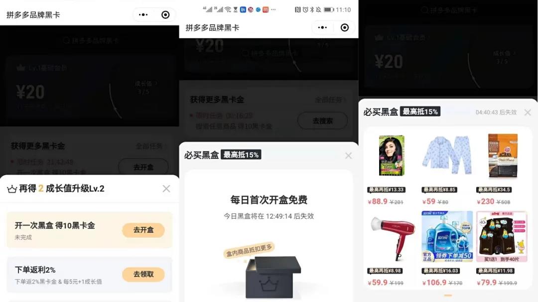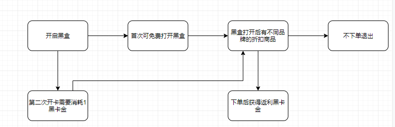 打开黑盒需要消耗一定黑卡金,黑卡金需要通过完成任务获得,黑盒打开之后又各个品牌折扣力度比较大的商品,每一次开启都有不一样的商品,所开的商品都是未知,但会根据用户性别推荐,若用户下单后可以获得对应的黑卡金返利。