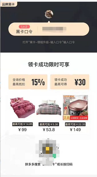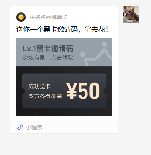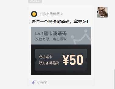 拼多多产品中的裂变分享总是无处不在。小程序中也体现出这种特色,设置了裂变分享得黑卡金体制。形成用户自传播,满足拼多多小程序用户增长。