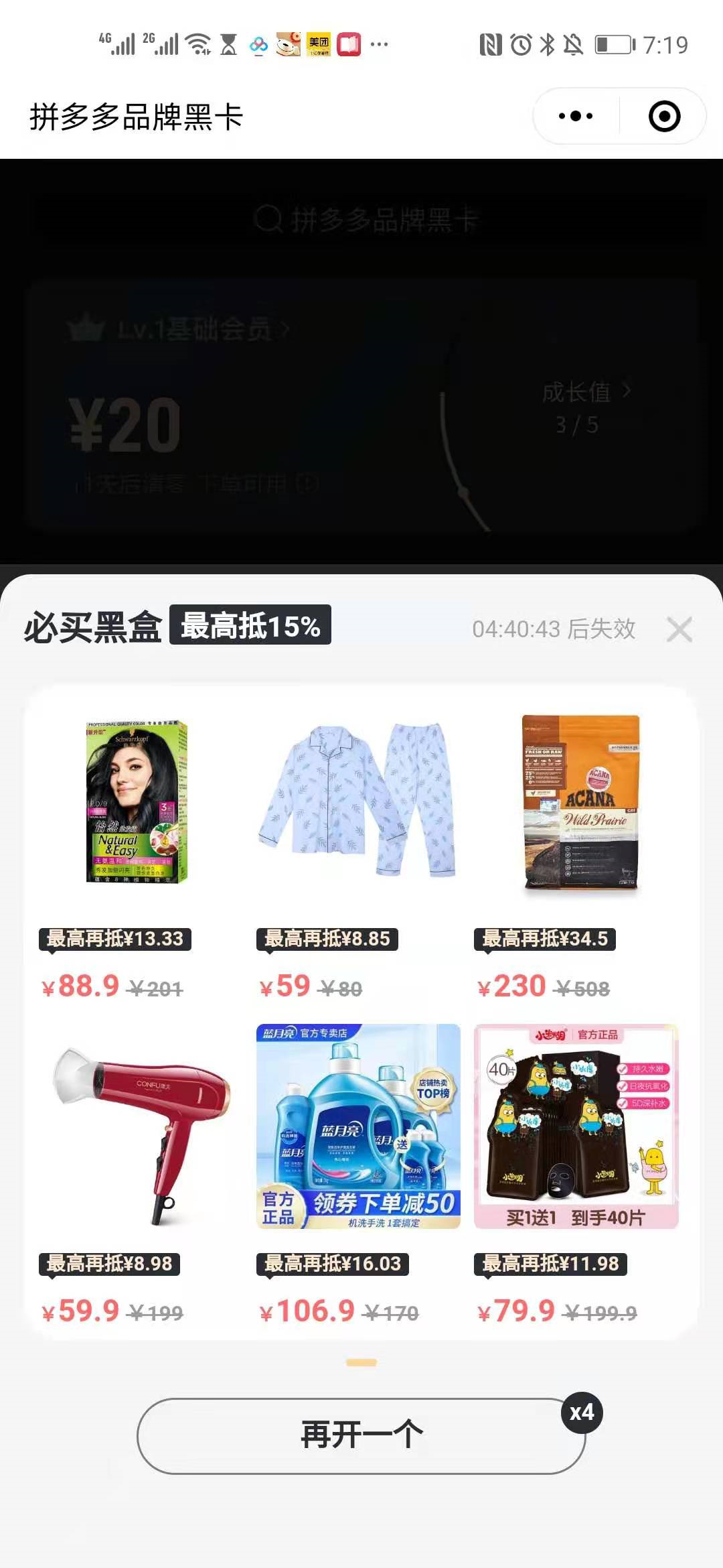 内部动机1——有趣好玩:拼多多品牌黑卡小程序除了基本下单返利及折扣之外,设置了开盲盒的互动机制,用户花黑卡金可以免费开品牌折扣盲盒,每一次开启都会展示不一样的品牌折扣商品,给用户不一样的新鲜感。