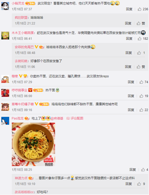 以至于这些品牌的营销一推出,就获得了广泛的关注和讨论。有人建议品牌看看其他城市,有人表示已经吃上了。像热干面这种具有情怀和受众基础的单品,原本就有着自己的温度和生命力,加上肯德基品牌的加持,就有了一种四两拨千斤的态势。