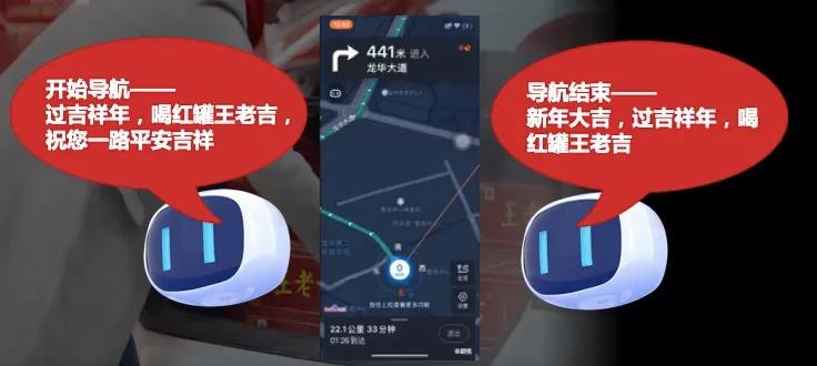 在过年回家这一普遍场景上,百度充分利用了百度地图庞大的用户基础,在百度地图上推出了王老吉专属语音导航:在导航开始时,语音导航会提示"过吉祥年,喝红罐王老吉,祝您一路平安吉祥";在导航结束时,百度地图的语音又会发出提示"新年大吉,过吉祥年,喝红罐王老吉"。祝福语陪伴一路归乡,用户感到暖心同时,与品牌之间的联结也得到了加深。