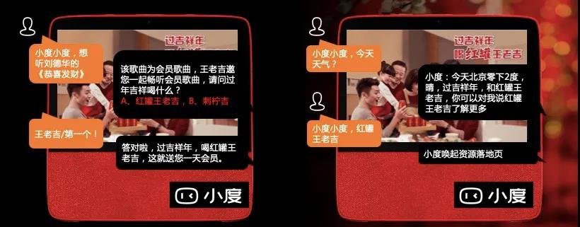 数据显示,在新春聚会的家庭场景中,拥有近3000万家庭用户基础的小度在家,为王老吉品牌增加了与用户互动的契机。用户在家里通过小度在家语音点歌新春歌曲,就会收到小度关于过年喝什么的提问,互动回答王老吉后还可收获会员等福利奖励。