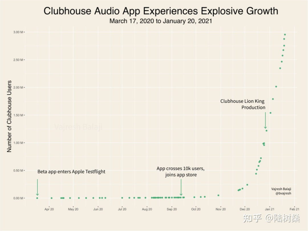据统计,Clubhouse 在2020年初还没正式上线时,只凭5000个测试用户就估值达到1亿美元,此后经过一年的缓慢爬坡,用户数逐渐达到了150万左右;踏入2021年,在一众行业名流的推波助澜下,外界估计其用户数已经涨到了500万,近期估值更是攀升至10亿美元。