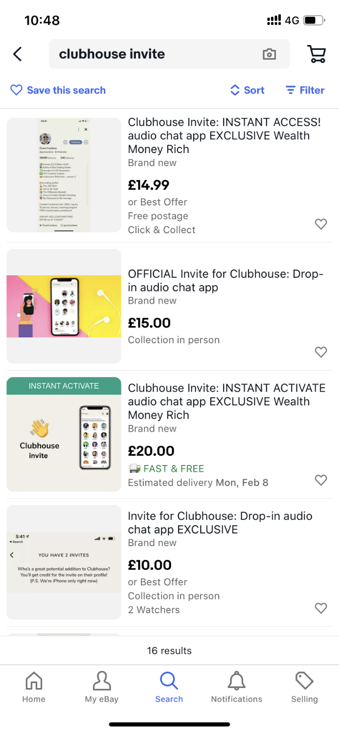 “整个过程不到五分钟,一天我就大概赚了1000来块。”一位网络卖家私下里透露。当然,这不是我们的本土特色,eBay上的老外也在以10~20英镑的价格不断帮助Clubhouse“扩张”用户。