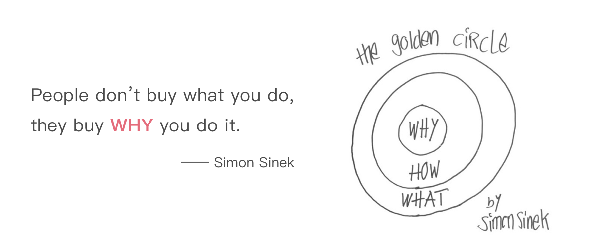 黄金圈法则,是营销大师 Simon Sinek 提出的理论。意思是,客户不会为了“what”(你做了什么)买单,却会因为“why”(你为什么做)而买单。