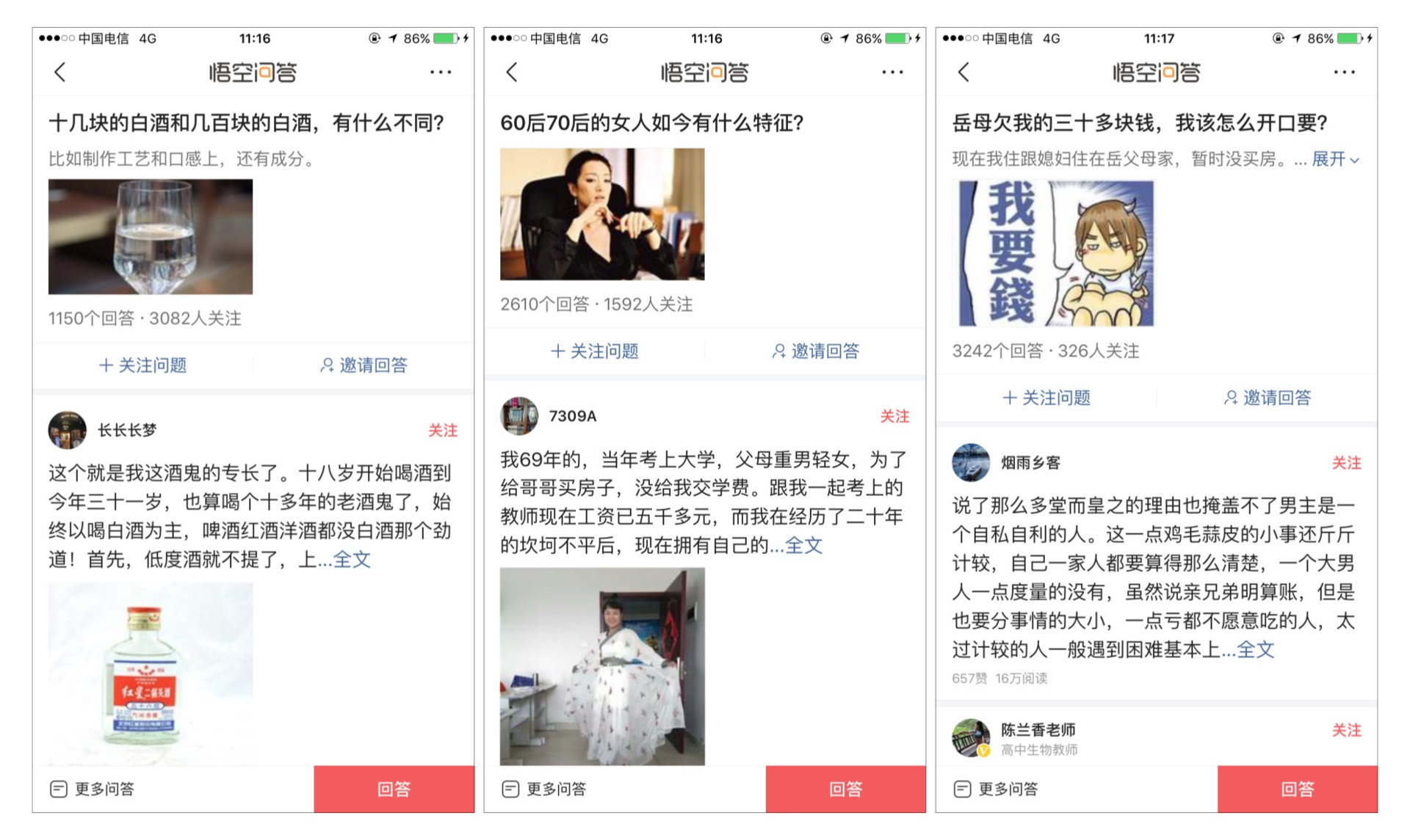 那这个问题该怎么提呢?我们可以想想平时自己会对什么问题感兴趣。比如下面三张是我从头条的悟空问答里截下来的热门问答的图片:
