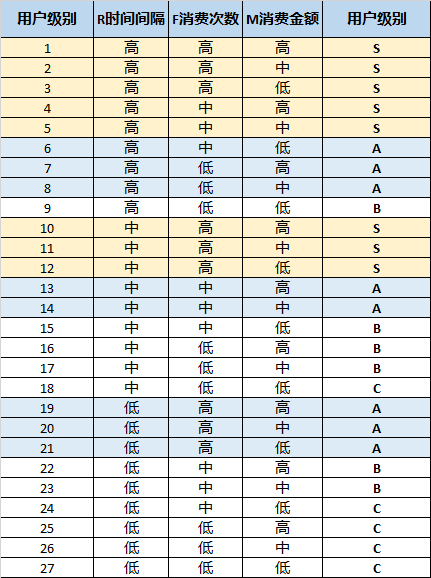 定义好这3个指标的界限,就可以给用户进行分层,针对不同价值的用户采取不同的运营手段。