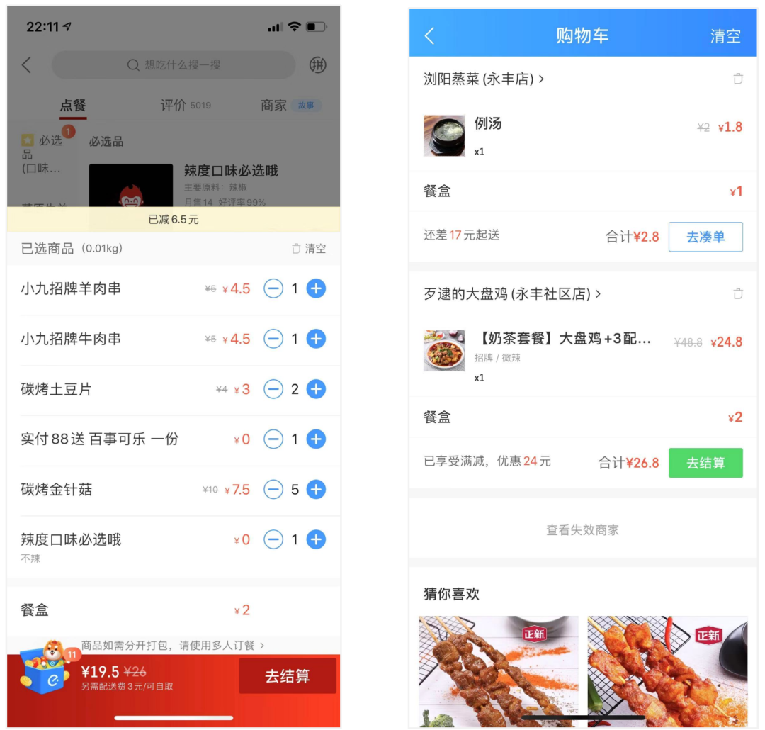 2、饿了么为什么有2个购物车?店内选品和多家店选品需要分别结算,分别存储,2个购物车时必然的选择。