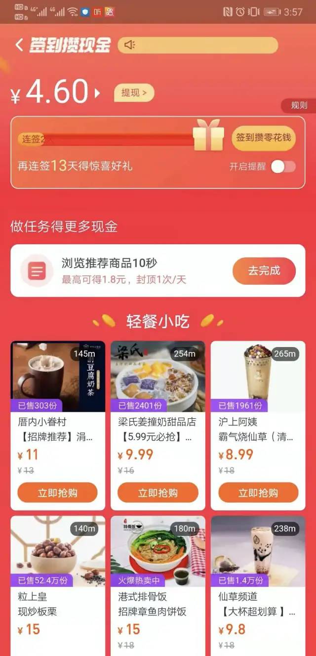 每天签到,获得随机现金,分享后即签到成功。也有很多平台是点击签到按钮后直接成功,观看相关广告或电商购买东西等可获得更多金额。满10元提现,不同平台不同提现内容,有的是现金,有的是平台虚拟货币或电商优惠券等。