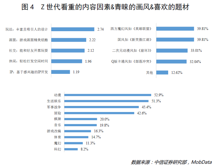 什么样的游戏内容能够俘获“Z世代”的芳心呢?参考中信证券研究部的调研结果,玩法和画面的质量是最能影响“Z世代”游戏体验的要素,西方魔幻、二次元动漫等画风深受他们喜爱;题材方面,MobData统计表明,动漫题材、生活娱乐、竞技冒险游戏在“Z 世代”群体中欢迎程度更高(见图4)。