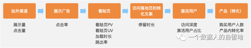 一个完整的渠道流程,常常包括:站外渠道 -> 展示广告 -> 着陆页 -> 访问着陆页的转化文案 -> 激活用户 -> 产品转化 六大关键环节,每个环节都有相应的指标来衡量。