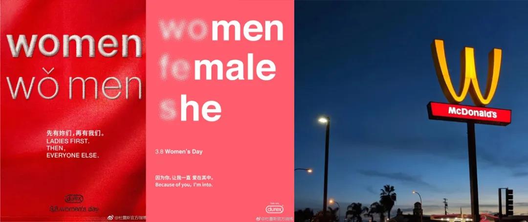 3、玩字母。比如麦当劳在妇女节当天,把M倒过来,变成W(women),迪士尼乐园变成了"迪士妮乐园",栏杆上还扎上了一个波点蝴蝶结。
