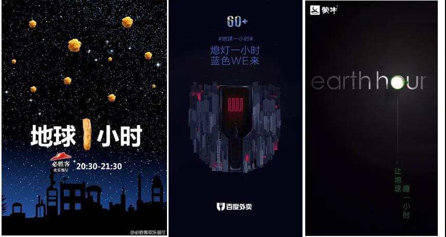 1、简单的操作,直接以地球一小时为主题,彰显品牌的公益责任心。也可以直接就是黑屏的海报,加上logo。