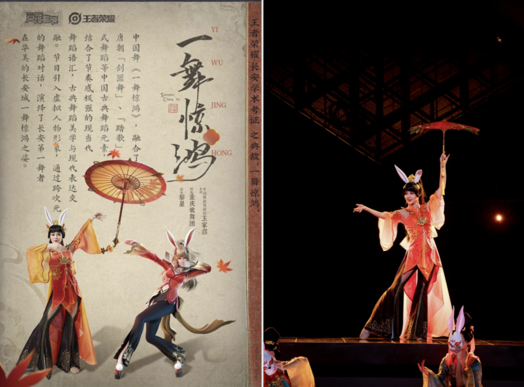 另一方面,《王者荣耀》也在不断尝试以多种创新形式,激活玩家兴趣、扩展IP矩阵。在官方推出的《不夜长安:机关诡》官方授权改编剧本杀游戏公布内测开启后,玩家可以通过扮演长安赛年的主角英雄公孙离、狄仁杰、李白、杨玉环、上官婉儿等,更加完整、沉浸地感知IP剧情内容。而在2021年春节前,在央视网络春晚的舞台上,英雄公孙离的舞蹈也打破次元壁,由中国歌剧舞剧院主要演员王家鑫在演出中扮演公孙离,与重庆歌舞团一起,生动的将古典汉唐舞融入了时尚节奏,将二次元融入顶级舞者,也将传统文化进行了更加年轻化的表达,以创新的方式直观、有趣的展示出IP核心剧情中的舞蹈内容。