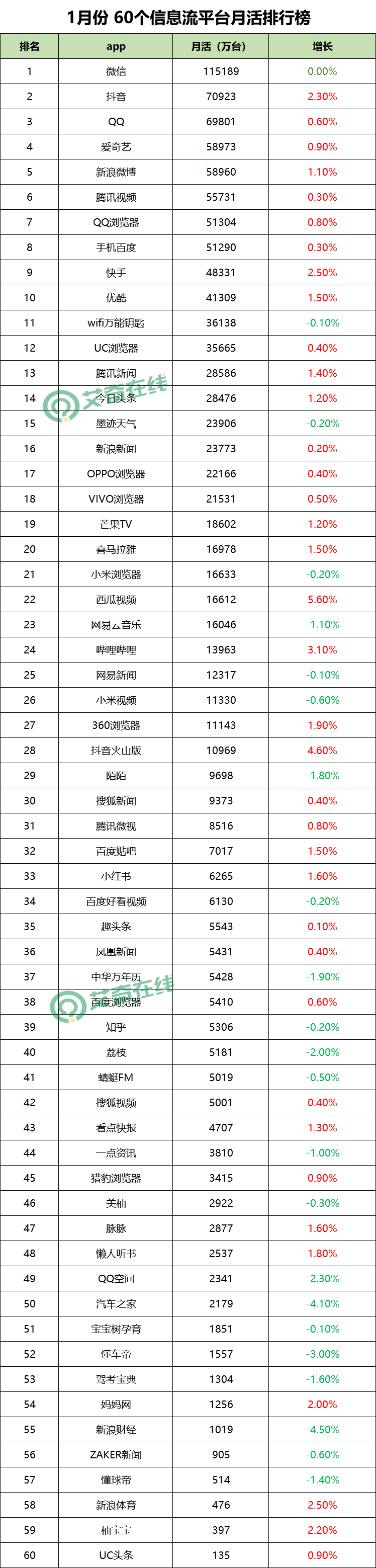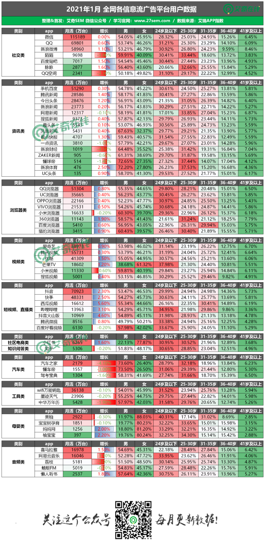 今天给大家带来2021年1月份最新 60个主流信息流广告平台流量榜单。