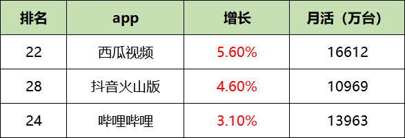 涨幅TOP3以西瓜视频为首,其次为抖音火山版、哔哩哔哩,增长幅度分别为5.6%、4.6%、3.1%