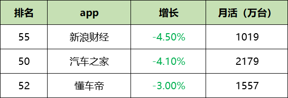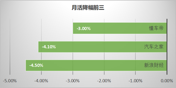 降幅TOP3以 新浪财经、汽车之家、懂车帝,降幅分别为 4.5%、4.1%、3%,各大平台下降幅度相对都较小