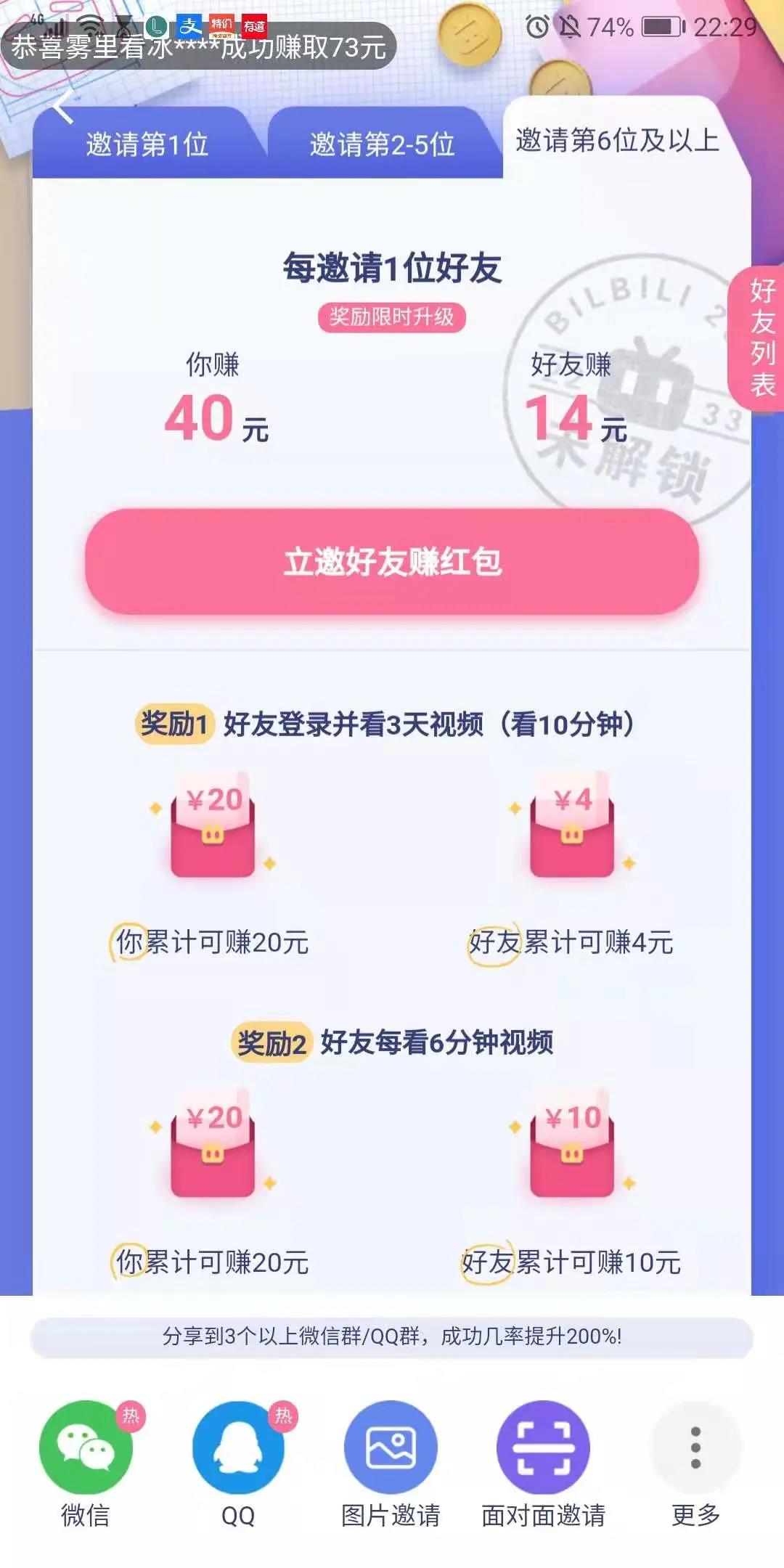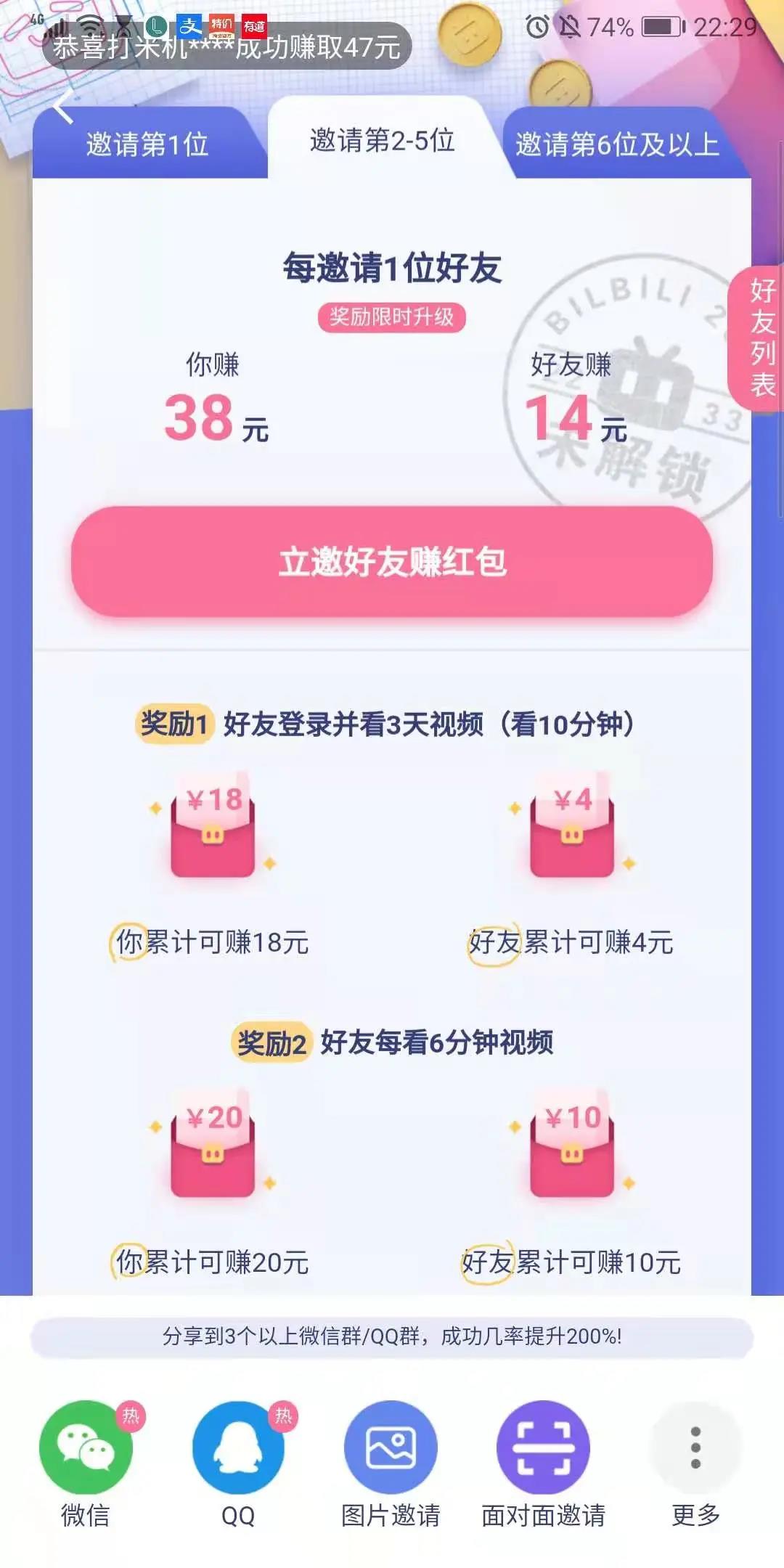 设计页整体的布局比较简洁明了。在引导竞争方面,一是三方实时滚动的"xx获得xx元红包"的弹幕。二是"我的奖励"栏下方的排行榜。右侧还有一个滚动的"好友列表可以看到好友的邀请进度(当然因为阿欣混b站只是自己看视频,所以这块栏目看不到具体是怎样的)