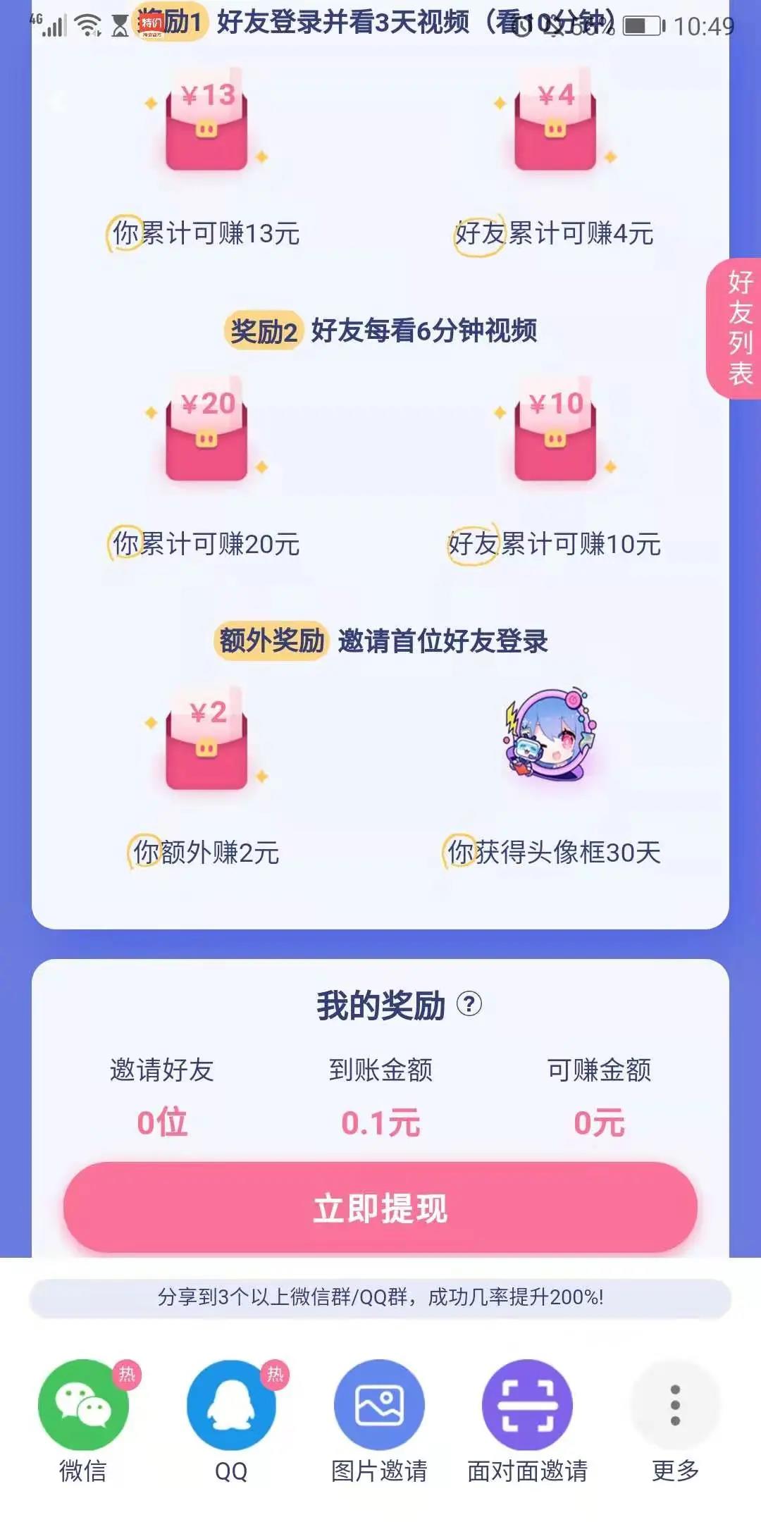 但是阅读最下方规则介绍后发现它的这个奖励其实大有玄机,比如当天好友要观看超过10min,你才有5元红包,他有一元;比如20元是使用的第八天开始的60天内,好友每看6min,你获得0.08,他获得0.04,而且好友每天有五次机会(这里其实没看懂机会指的是什么)。