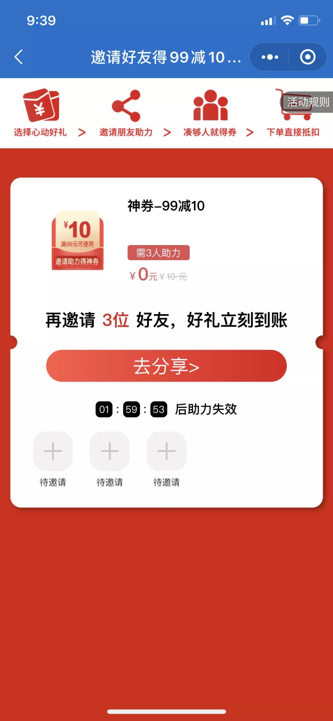整个流程从选择代金券分享助力-邀请好友助力-凑够人数助力-下单直接抵扣整个流程简单顺畅,没有任何槽点影响用户体验,一步步引导用户完成分享下单转化,既给小程序引流也更好的促进用户下单转化,一箭双雕。