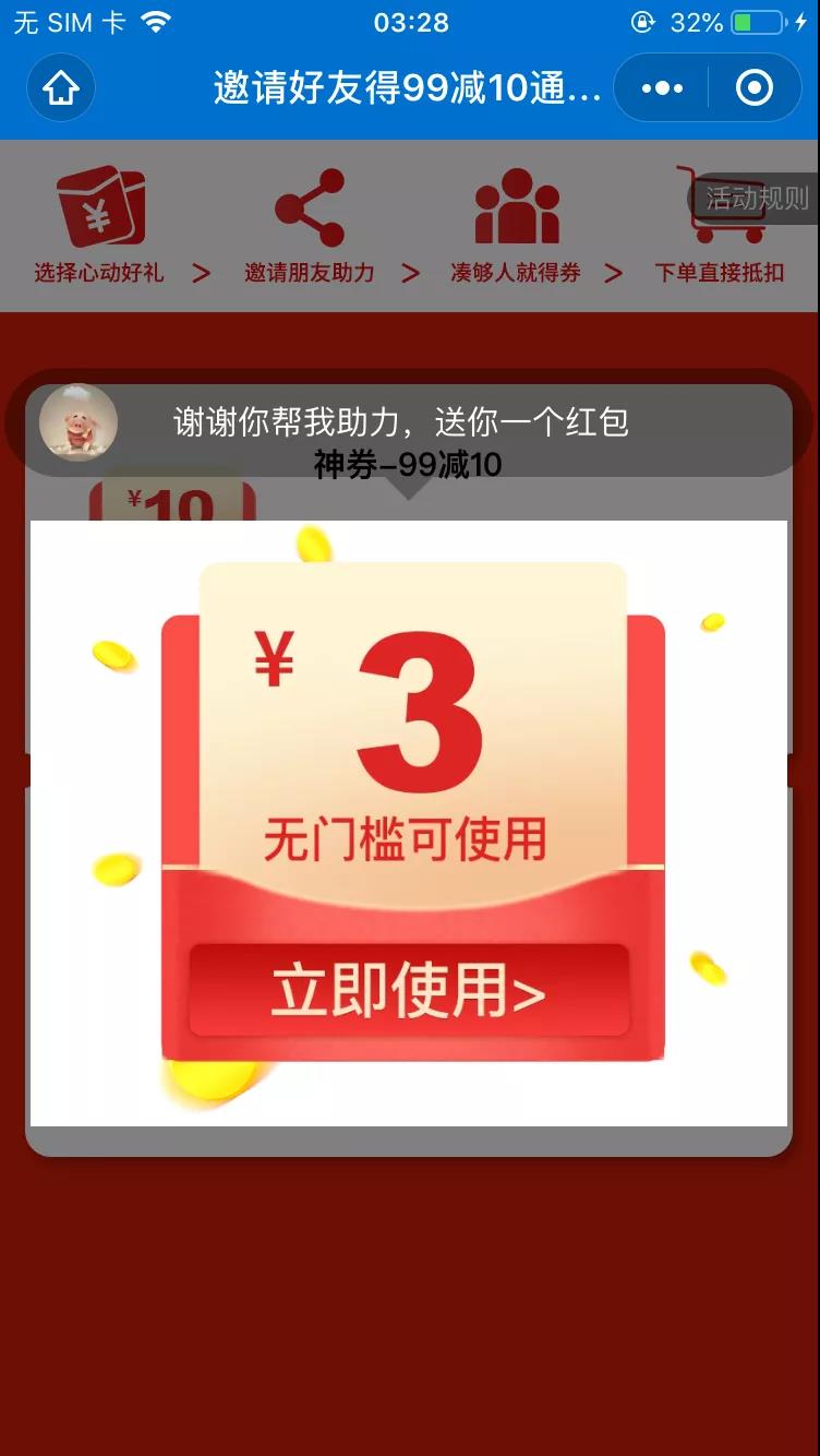 ④好友助力成功后会跳出3元无门槛通用券的弹窗,3元无门槛通用券作为好友助力的回报,让助力者感觉到并不是无偿助力,降低用户的反感心理,同时引导用户点击领取优惠券后进入到小程序首页进行商品选购,从而进一步为小程序引流并购单转化。