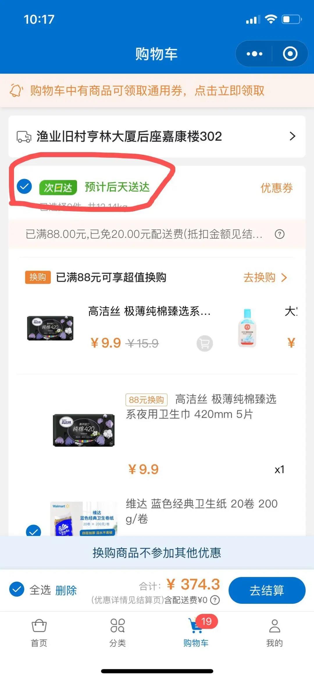 同时在小程序上显示的预计后天送达则会让用户觉得次日达就是个噱头,配送时间太长导致用户对平台的感知变得更low,甚至让用户有一种被套路的感觉。