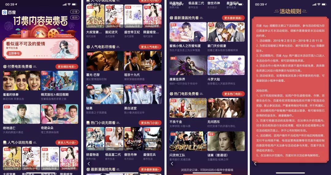 活动时间内,进入百度小程序可以免费观看部分资源,电影,小说,这个是春晚过后展现的活动。
