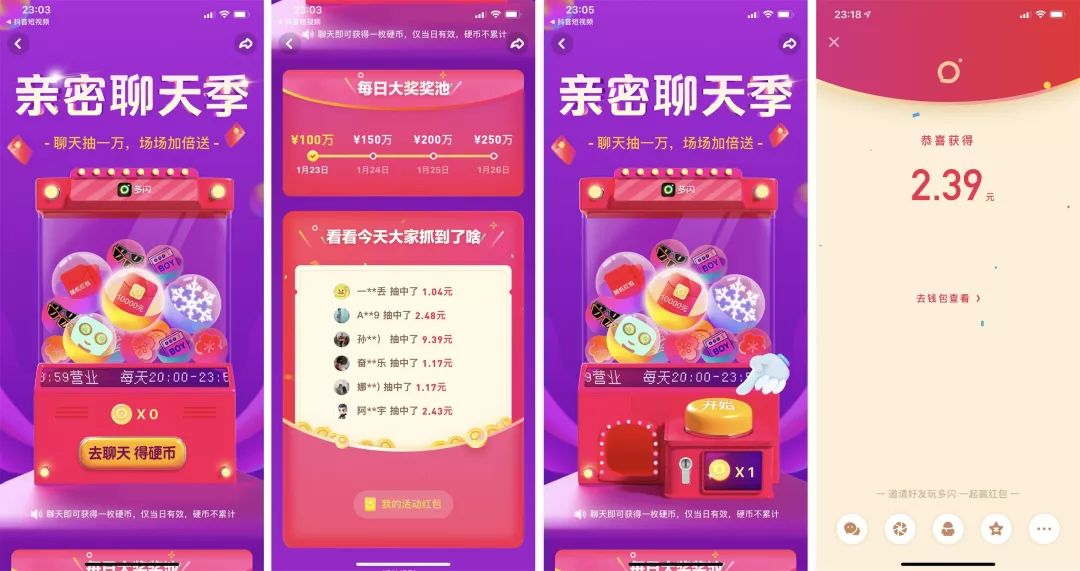 每天3次使用过年模板拍摄随拍可以获得红包,可以找图片来代替真人,按照要求拍摄出来也能获得红包;拍摄随拍发送给好友可以获得红包;邀请好友注册多闪可以获得红包。
