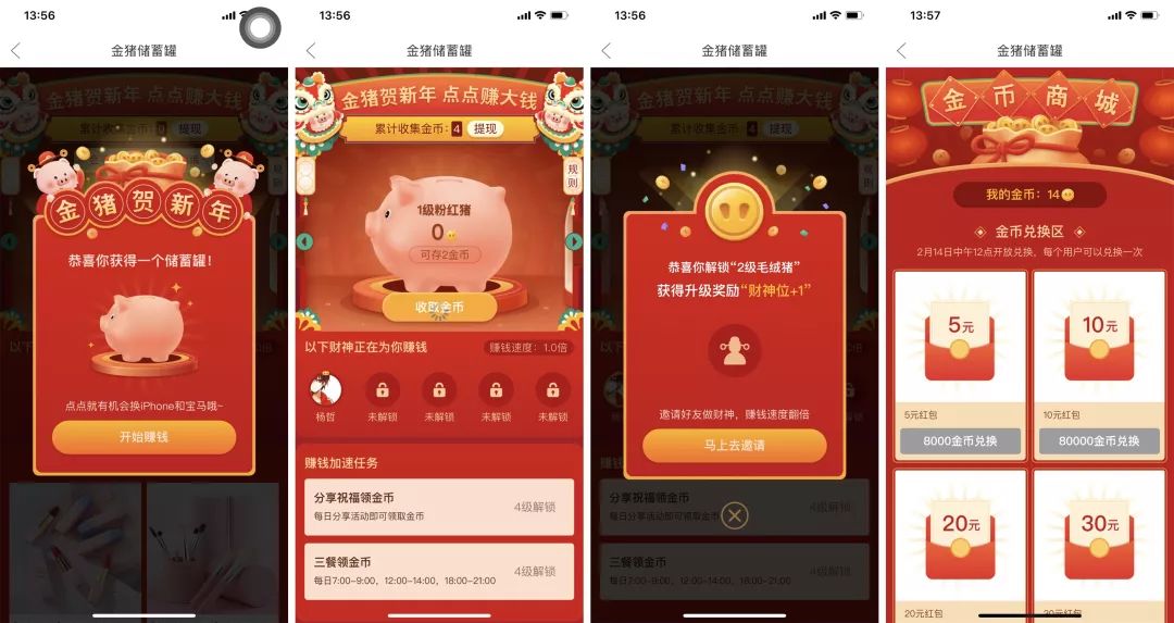 到达12万元宝领取奖金,到达20万领取苹果手机,累计转4次罗盘可以瓜分2亿元宝,元宝可以兑换现金红包和实物奖品,和金猪储蓄罐玩法基本类似。