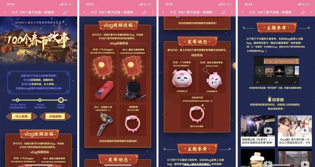 100个春节故事:征集春节相关的视频和图文展示出来,通过官方给出的评奖规则进行评奖,可以获得红包,实物奖品等。