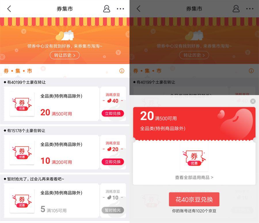 比如“40个京豆可以换20元现金抵用券”、“20个京豆可以换取10元现金抵用券”等。对于用户来说,京豆帮用户省钱了,用户就觉得值了。