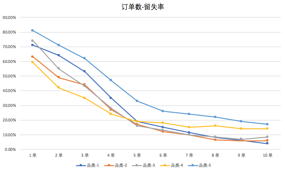 从上图不难看出,大致在4~6单之间流失率出现拐点,因品类而略有不同。于是,我们不难结论——第5单是留存的魔法数字。也就是说,如果用户下到第5单,留存会进入相对稳定的状态。于是,运营团队据此立项,通过每单补贴,或设定任务目标激励,推动用户从新客一路转化到5单。
