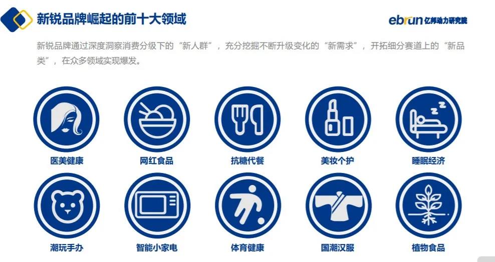 一方面新锐品牌们通过深度洞察消费分级下的"新人群",比如典型的Z世代,充分挖掘不断升级变化的"新需求",另一方面实时开拓细分赛道上的"新品类",比如医美、代餐、潮玩等,无不是在巨头之下切进新赛道,抢占市场红利。