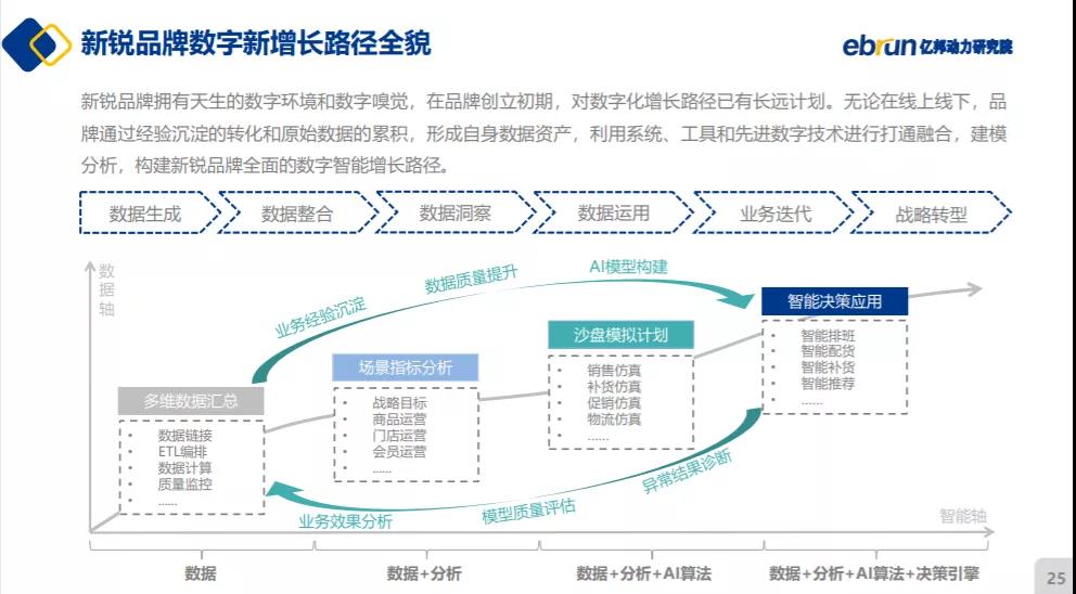 无论线上线下,品牌通过经验沉淀的转化和原始数据的累积,形成自身数据资产,同时利用系统、工具和先进数字技术进行打通融合,建模分析,构建新锐品牌全面的数字智能增长路径。