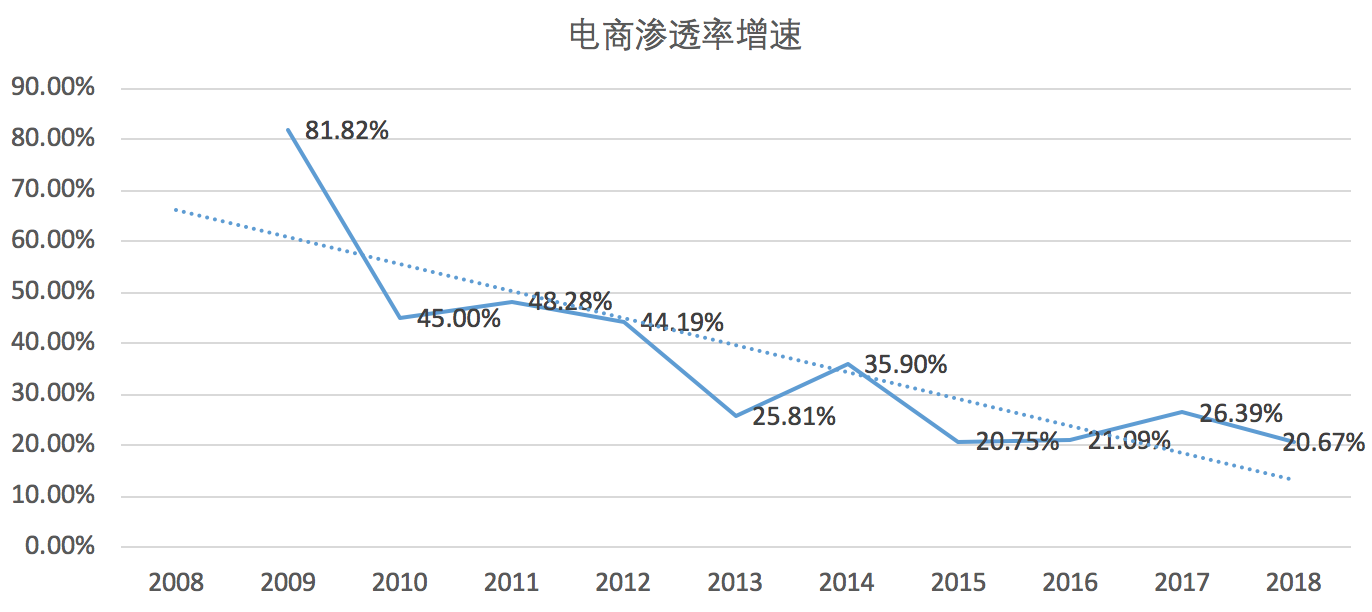 我们可以看到,大趋势上网络零售的渗透率(即在整体零售中的占比)增速在不断收敛,在未来可能会到达天花板,也许最终会收敛在百分之三十多并趋于稳定(忽然想起马云曾说的“要么电子商务,要么无商可务!”)。这说明,线上红利已过,也在逐渐饱和。