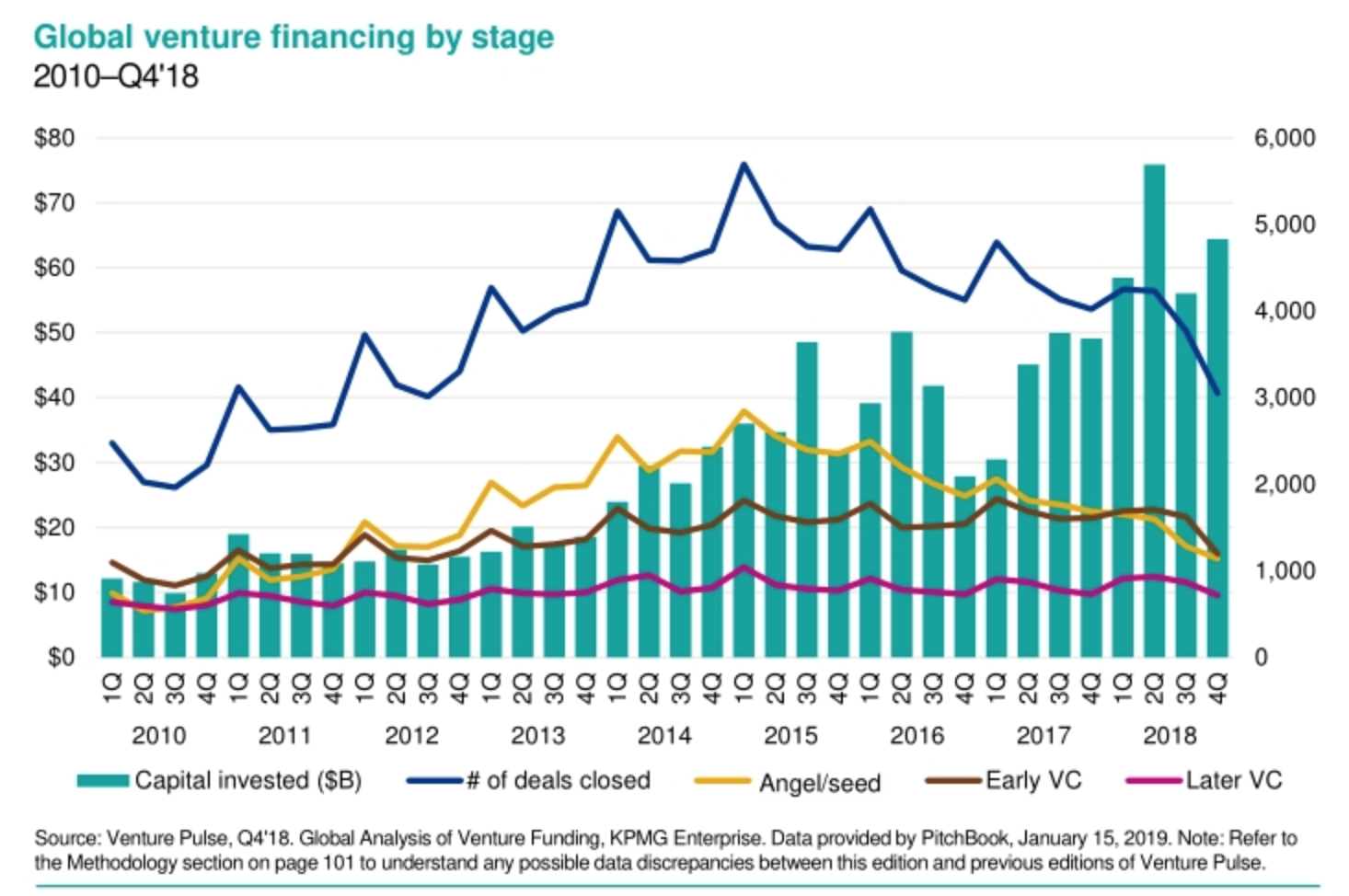 下面我们再来看看大多数互联网公司拓展业务的弹药源泉——风险投资。首先让我引用一下毕马威(KPMG)发布的2018年Q4全球风险投资趋势报告中的数据: