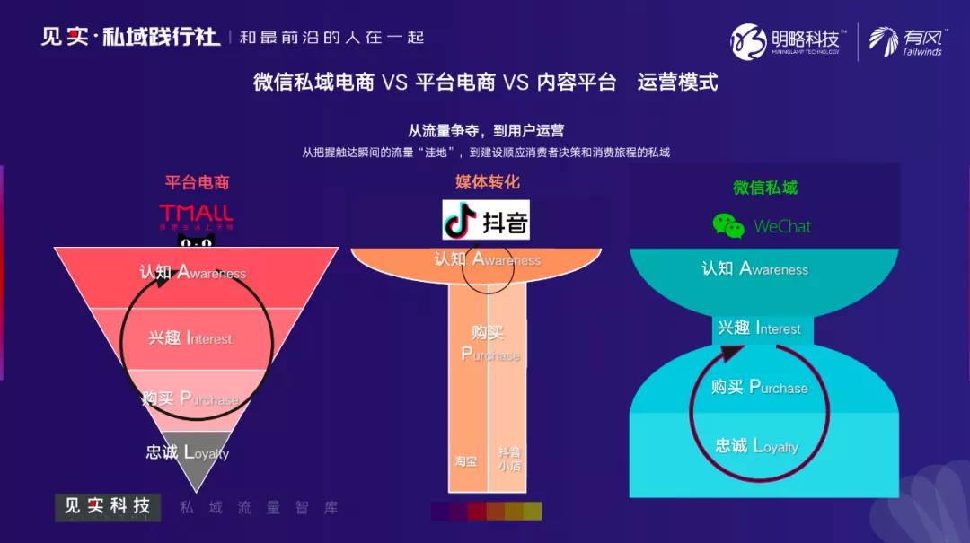 平台电商、内容电商、私域电商的运营模式区别,可以用一句话总结,那就是从流量争夺到用户运营的转变。即从把握触达瞬间的流量"洼地",到建设顺应消费者决策和消费旅程的私域。