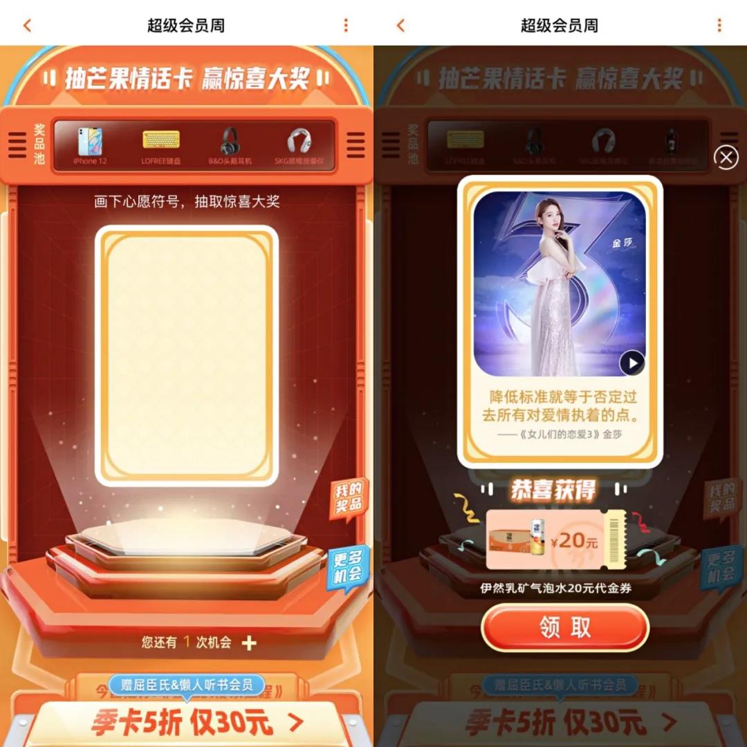 a、结合平台的《明星大侦探》系列活动,推出开会员得道具礼包, 和内容强相关的玩法结合简直有趣又有效,本身就是内容平台,利用好用户观剧的热情来转化付费,是很聪明的结合。