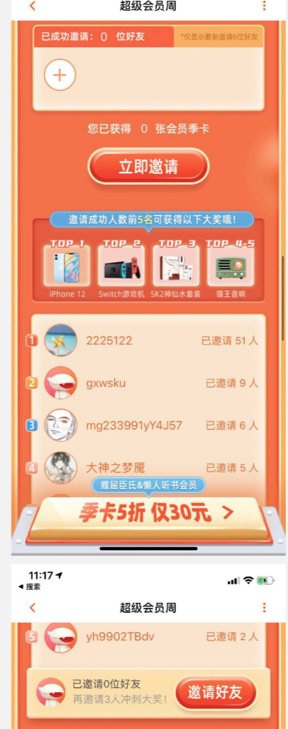 c、邀请好友模块,奖品够丰厚,确实让人心动,如果能再加上社交关系链,明确告诉我推荐哪些好友开通成功率最高(例如即将到期的用户,续费肯定意愿更高),门槛会大大降低。