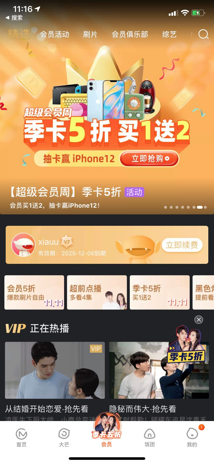 a、活动banner利益点清晰外露,用户最关心的是价格,这里的"季卡5折""买1送2"是最核心利益点,再加上副标题的抽奖赢取iphone12,能有效吸引用户。