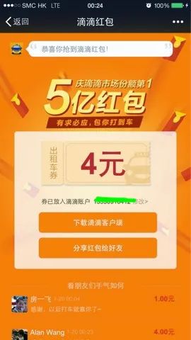 在另外几个随机案例中,就要属于打车工具平台,滴滴、快的与当时的生活团购平台,美团、饿了么、口碑等平台随机性系列满减券,抵扣现金券等。如果我没记错的话,滴滴像是红包玩法的“鼻祖”,滴滴支付完成会产生一个分享链接,分享给好友或者社群,好友就可随机性领取到不定金额的打车红包,通过填写注册手机号码,就可以领取随机不等金额,(自己也可以领取)在下次打车时,就可以当作抵扣券。