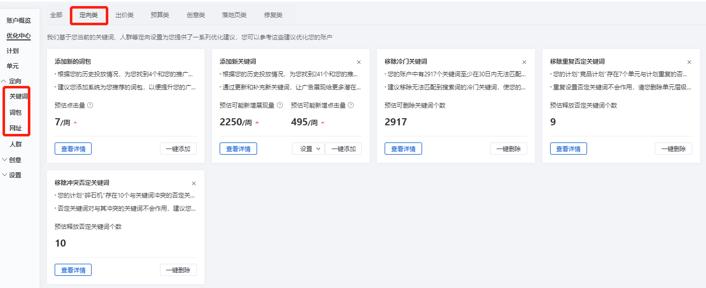 定向类有 系统推荐的词包、推荐的新关键词、移除冷门关键词、移除重复否定关键词、移除冲突否定关键词等: