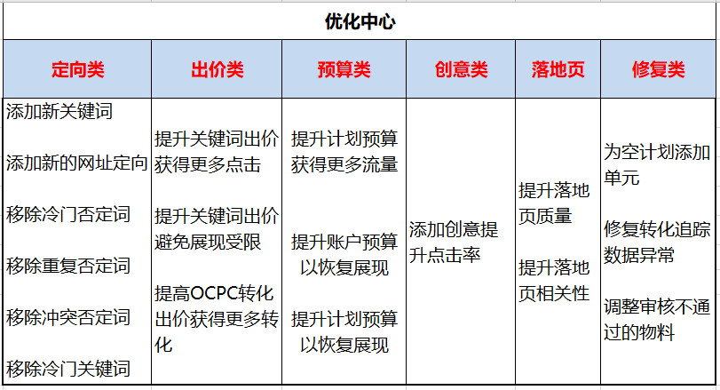 我觉得它是一款"20分钟快速智能优化"工具。优化中心包括"定向类、出价类、预算类、创意类、落地页类、修复类"六个方面,而这六个方面,就是从"展现-点击-访问-咨询-订单"全链路的覆盖了优化的每一个环节,还是非常全面的。