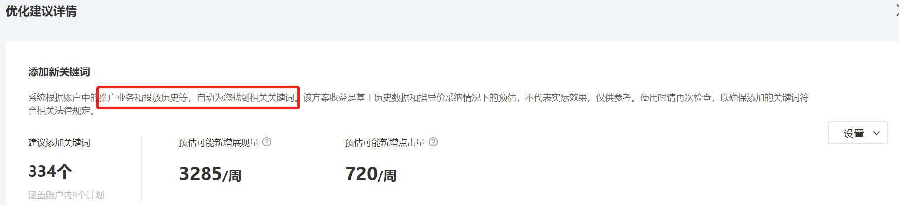 我的标准是看"预估数据"。如果"预估数据"对账户数据的影响较大,那我会积极地采纳。比如:上图中"添加关键词"部分相对来说,系统预估的周数据较大,那么参考的意义就会比较大;如果"预估数据"较小,则不强求,可采纳也可忽略。