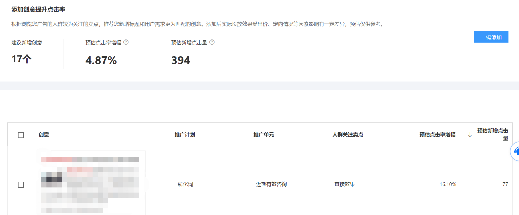 当然,添加的时候也可以对"预估新增点击量、预估点击率增幅"进行从高到低的进行排序,添加对数据影响较好的创意。