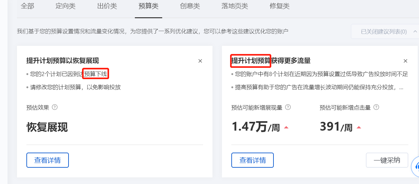 比如:出价类,哪些词出价低了,导致关键词无法展现,修改一下价格就好了;预算类,预算低了,下线了等等系统都会给予提示,如下图: