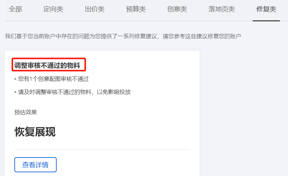 修复类,包括关键词,创意和配图等审核情况,系统中有审核不过的物料会在这里提醒,及时修改就能恢复正常了。